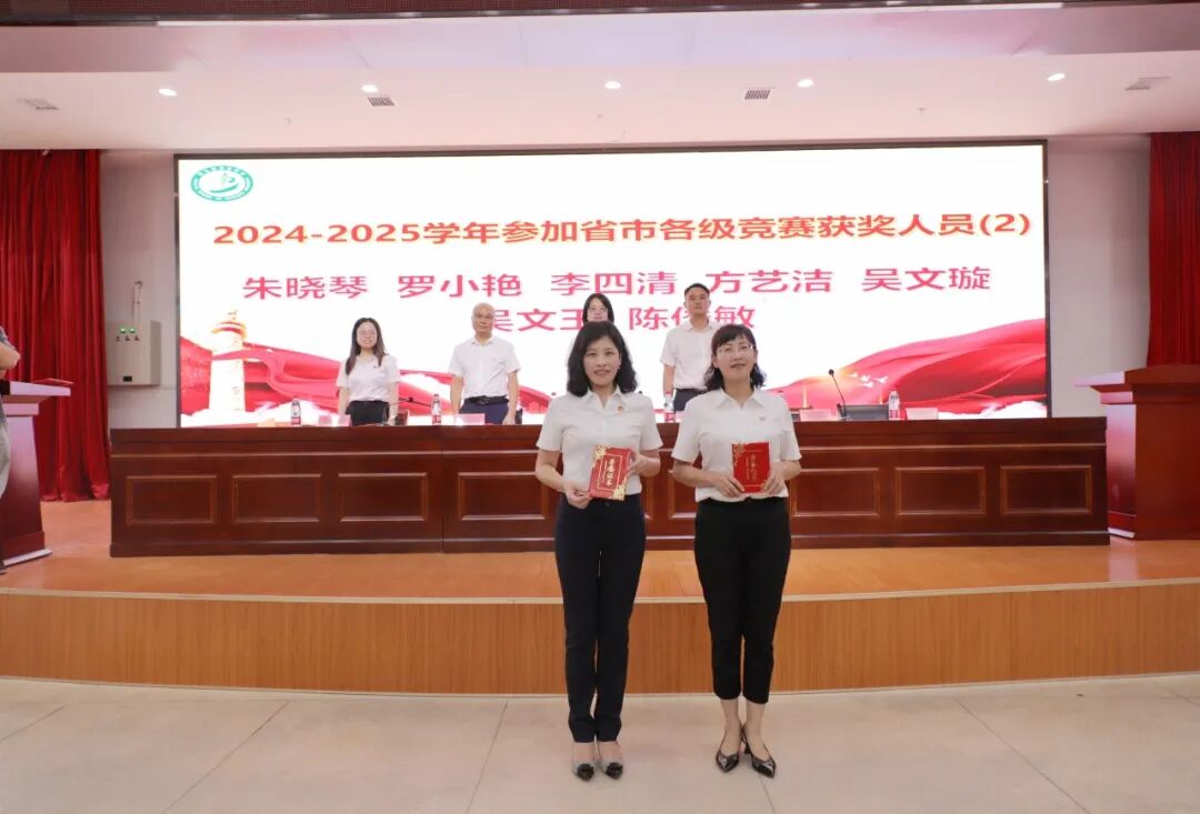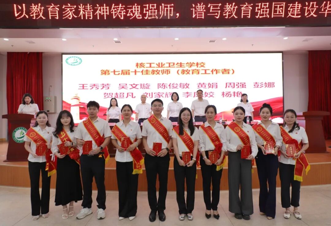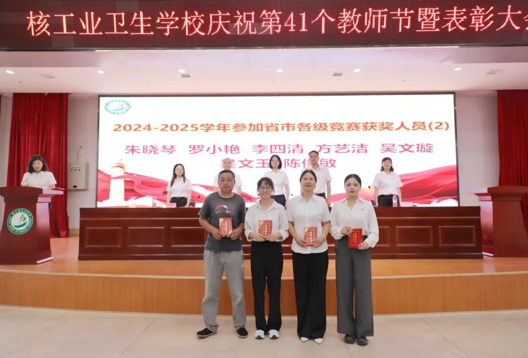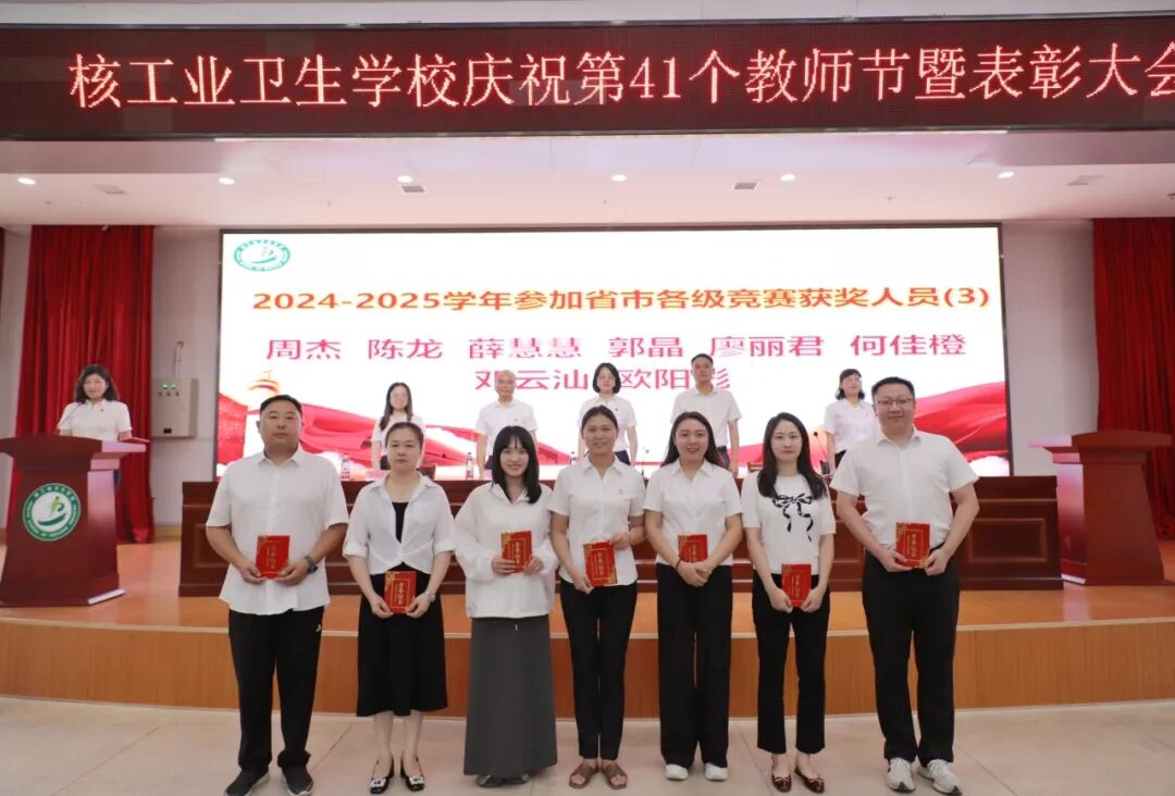 党总支副书记李建树宣读核工业卫生学校第七届十佳教师(教育工作者)的表彰决定及2024-2025学年各类国家级、省市级比赛获奖名单,授予王秀芳、吴文璇、陈俊敏、黄娟、周强、彭娜、贺超凡、刘家辉八名教师“十佳教师”称号,李凤姣、杨艳两名教师“十佳教育工作者”称号。