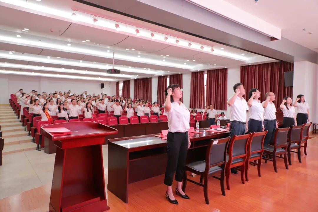 全体教师在前任教务科科长何旭峰的带领下,庄严宣誓,立志做一名忠诚党的教育事业,笃行教书育人职责的四有好教师。