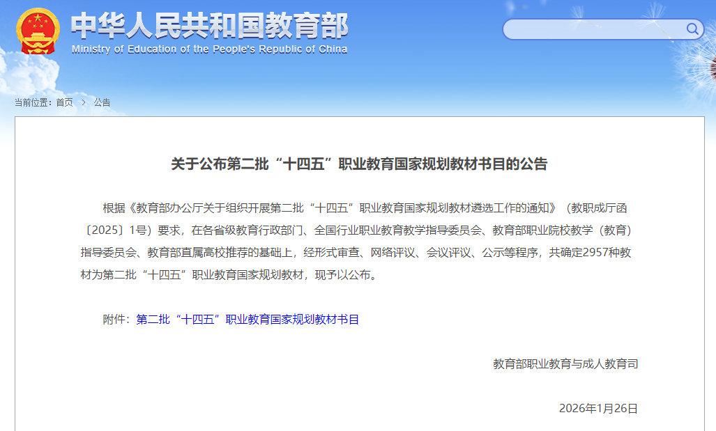 本次遴选严格遵循“坚持正确导向、突出职教特色、适应产业需求、严格把控质量、严守底线要求”五大原则,全国共遴选产生2957种国家规划教材,是对“十四五”职业教育教材建设成果的集中检验。此次我校三本主编教材同时入选,既是教育部对学校教材编写质量的权威认可,也是学校践行“立德树人、技能成才”职教理念的生动实践。